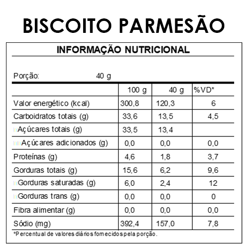 Ingredientes: Polvilho, ovos, óleo de soja, queijo, CP parmesão, ricota, água, composto lácteo e sal.