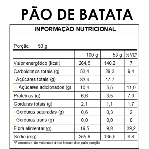 Ingredientes: Farinha de trigo, água, açúcar, margarina vegetal, ovos, sal, fermento biológico, batata em flocos, melhorador de farinha e composto lácteo.