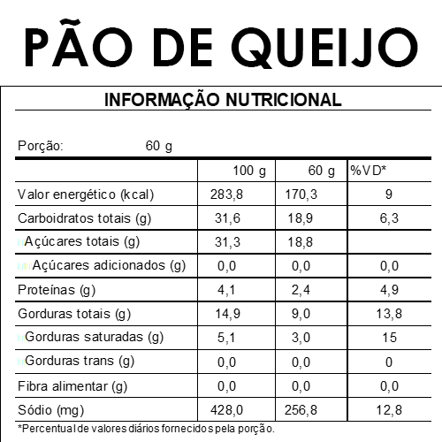 Ingredientes: Polvilho, ovos, queijo, óleo de soja, composto lácteo, água, margarina, CP meia cura e sal.
